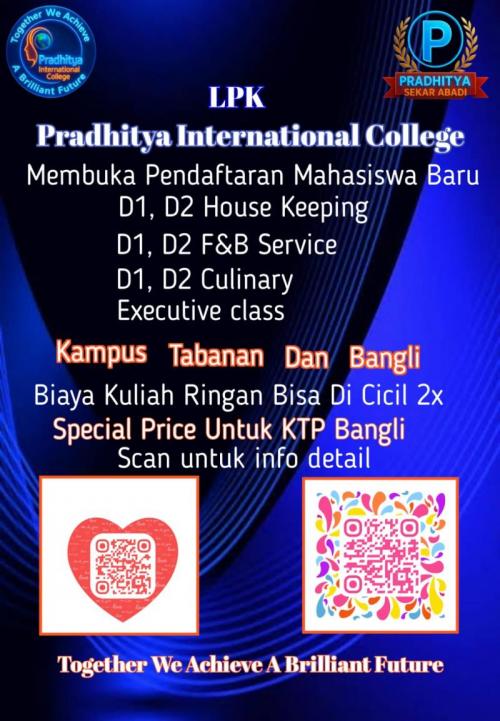 Bergabunglah Bersama LPK Pradhitya International College! Kami membuka pendaftaran mahasiswa baru untuk program: D1, D2 Housekeeping D1, D2 Food & Beverage (F&B) Service D1, D2 Culinary Executive Class Lokasi kampus: Tabanan Bangli Keuntungan kuliah di Pradhitya International C...